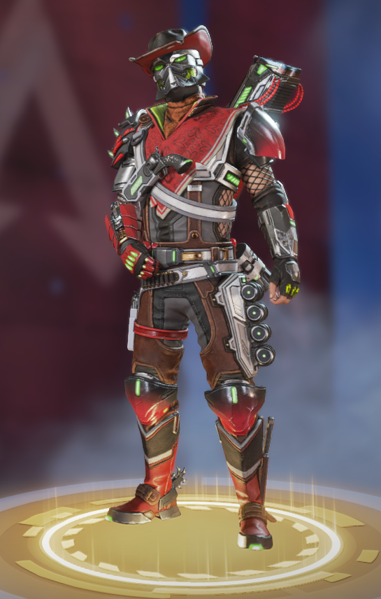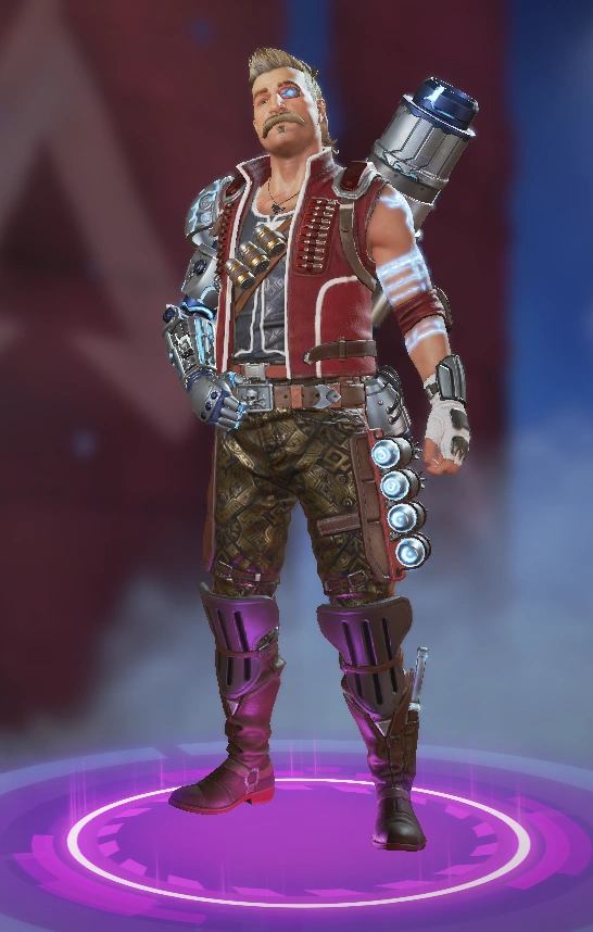 Fitzroy hosted a welcoming party on Solace, riding into Kings Canyon on a refurbished IMS Thermopylae.[7] During the ceremony, Maggie hacked into the Thermopylae's systems, demanding the delivery of Fitzroy’s other arm. She then hijacked the ship’s artillery cannons, forcing Fitzroy to use a grenade to destroy its systems. Maggie finally set off explosives she had planted around the arena, causing the destruction of most of the surrounding area and the crashing of the Thermopylae in the north of Kings Canyon. Afterwards, he conveyed his backstory to the other Legends and took part in a match of the Apex Games.