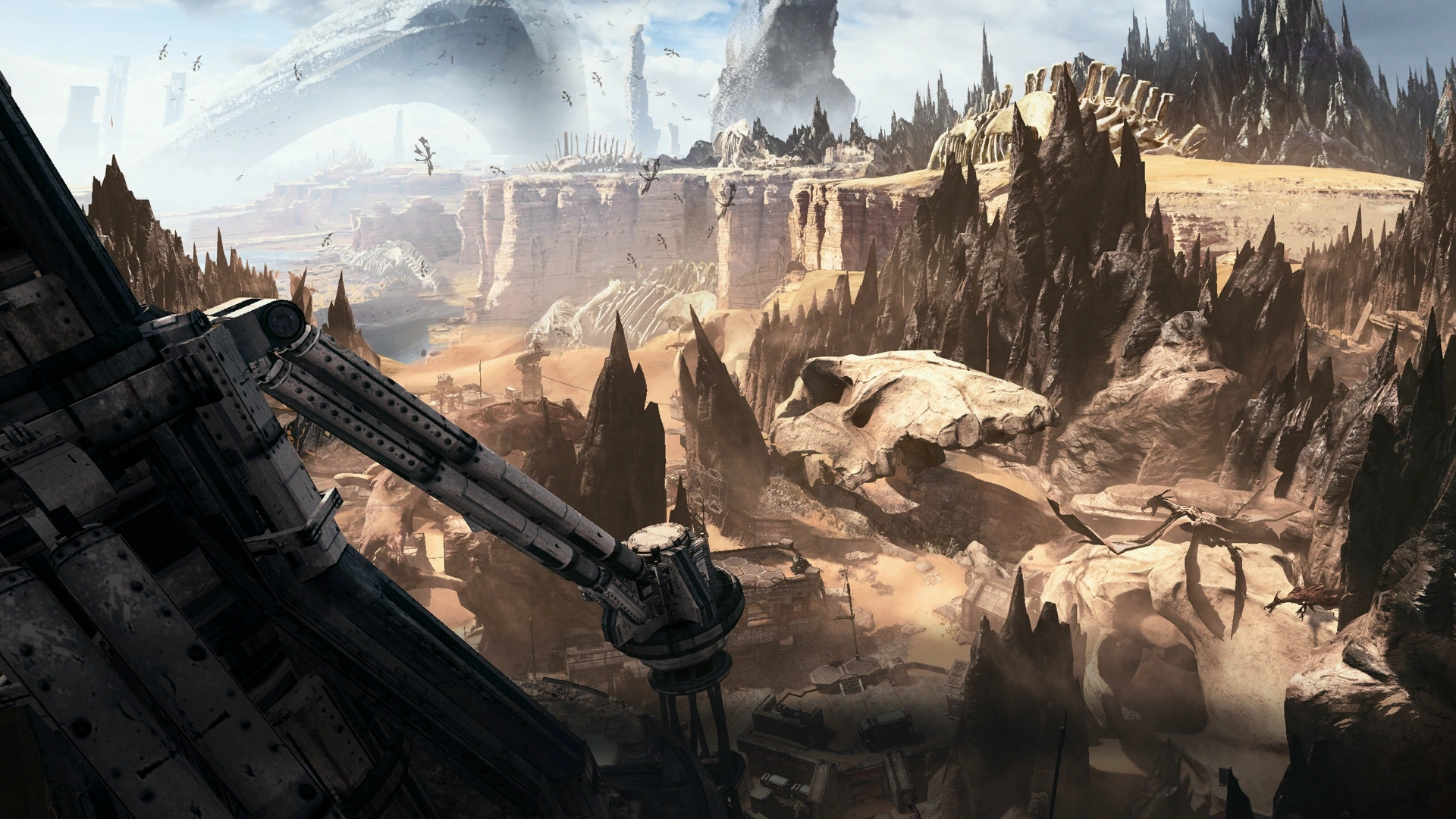 Leviathan is mainly desert, with multiple humid swamps. These planetary conditions are hospitable for humans, though the local wildlife is not. The population of the planet has depleted to less than 100,000 due to its extremely hostile wildlife. To combat this, IMC scientists created the Repulsor Tower. This new technology kept the wildlife away from cities and IMC facilities. One of these facilities, named Base Golden, was used to create and test the Repulsor Towers used all over the Frontier. Although it has been abandoned since 2690[12], the Militia sought out the base in 2710 to study the Repulsor Tower there in order to formulate a means of exploiting its weaknesses in preparation for their assault on Airbase Sierra. Despite the IMC's best efforts in battling them on the base grounds and the surrounding Boneyard, the Militia were successful in developing a "tower-toppling" Data Knife.[13]