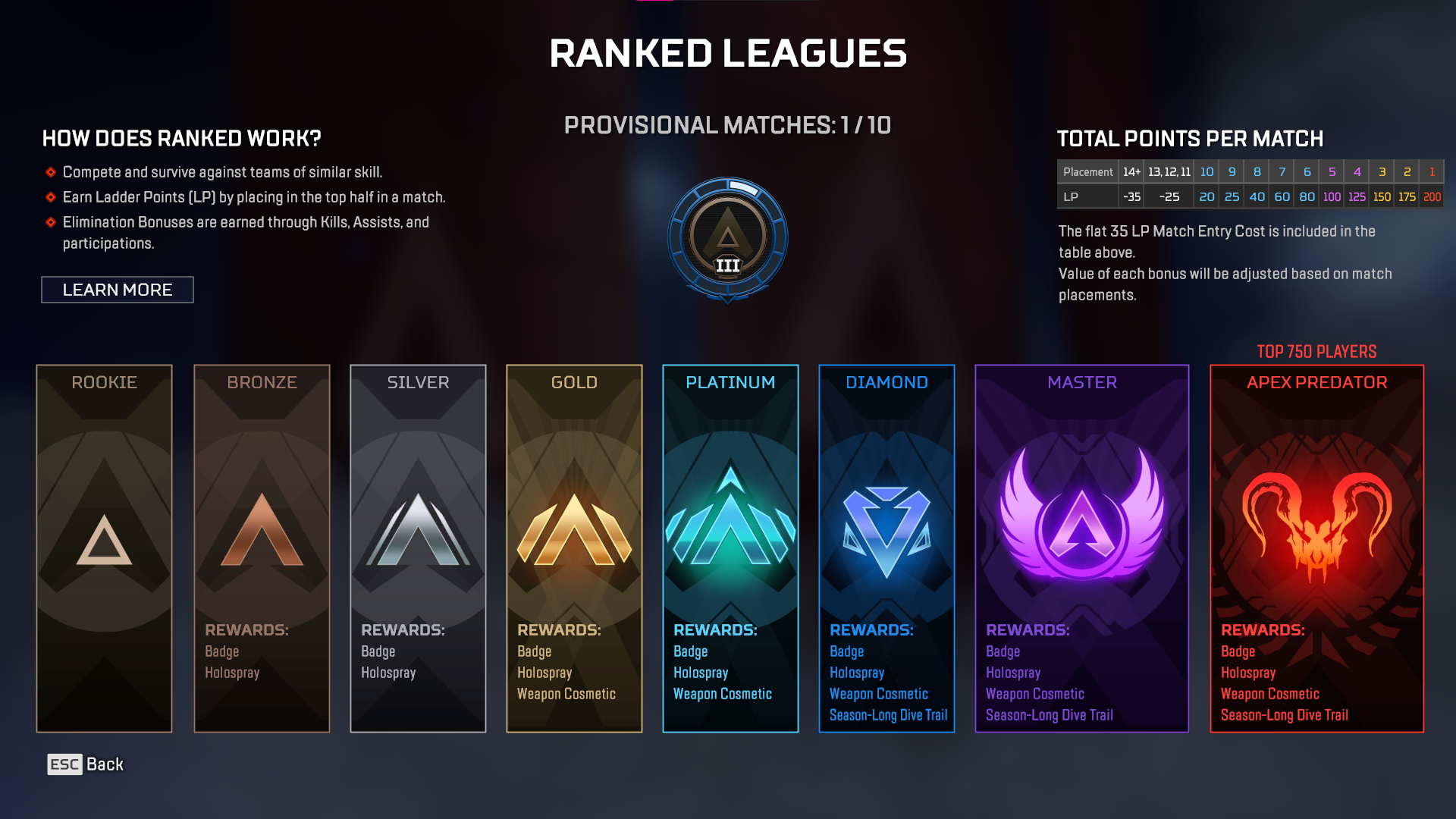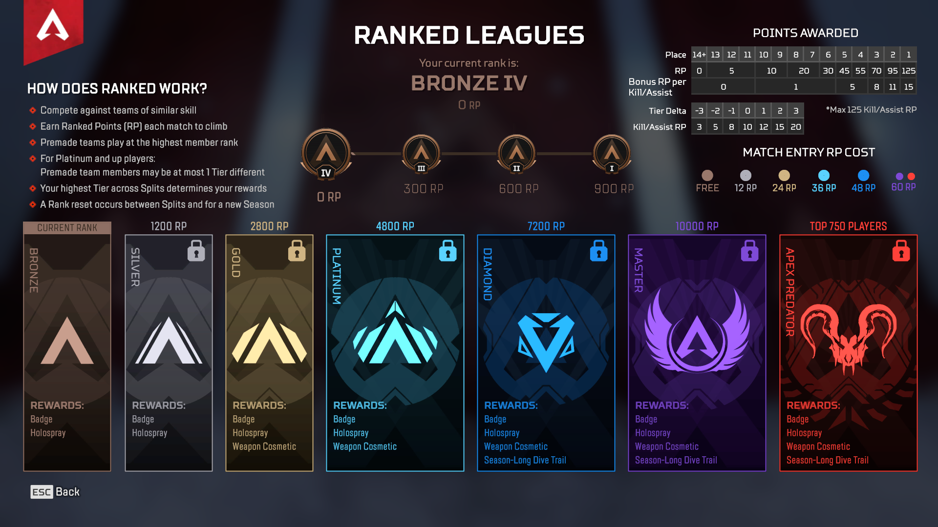 Players are divided into eight tiers, each with four divisions, except Master and Apex Predator where players are ranked globally via their current RP. The rankings are based on platform.