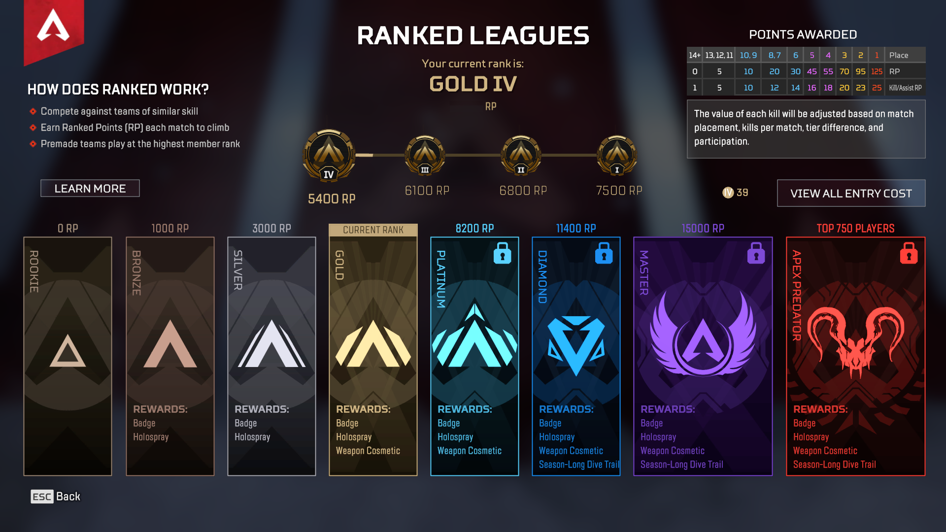 Ranked matches play the same as the normal Battle Royale in squads of three with the only difference being the matchmaking and the awarding of Ranked Points (RP) after every match. In Ranked, players are matched with players of the same or similar tier with placement. RP is is used to measure progress to the next tier. Each match deducts a small amount of RP to enter, but the players can earn more by getting kills, assists and high placement.