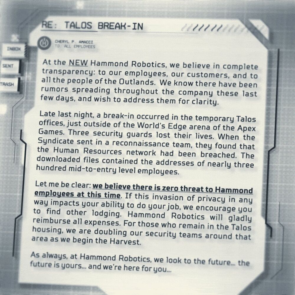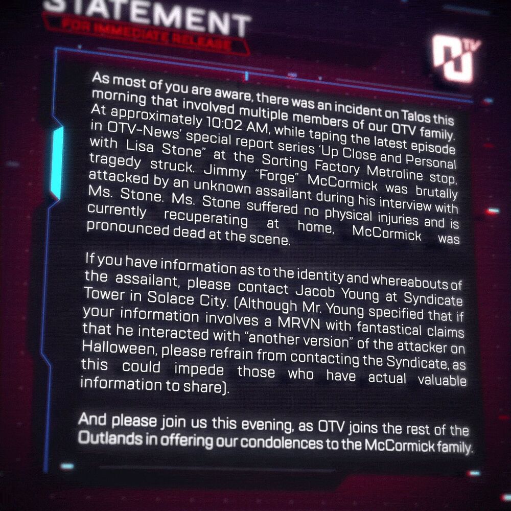 Outlands TV hosts an interview with James “The Forge” McCormick, a popular new Legend who is sponsored by Hammond Robotics. At 10:02 A.M., [11] during the broadcast, McCormick is murdered by Revenant live on television. [12] OTV later issued a statement of condolences for McCormick. [11]