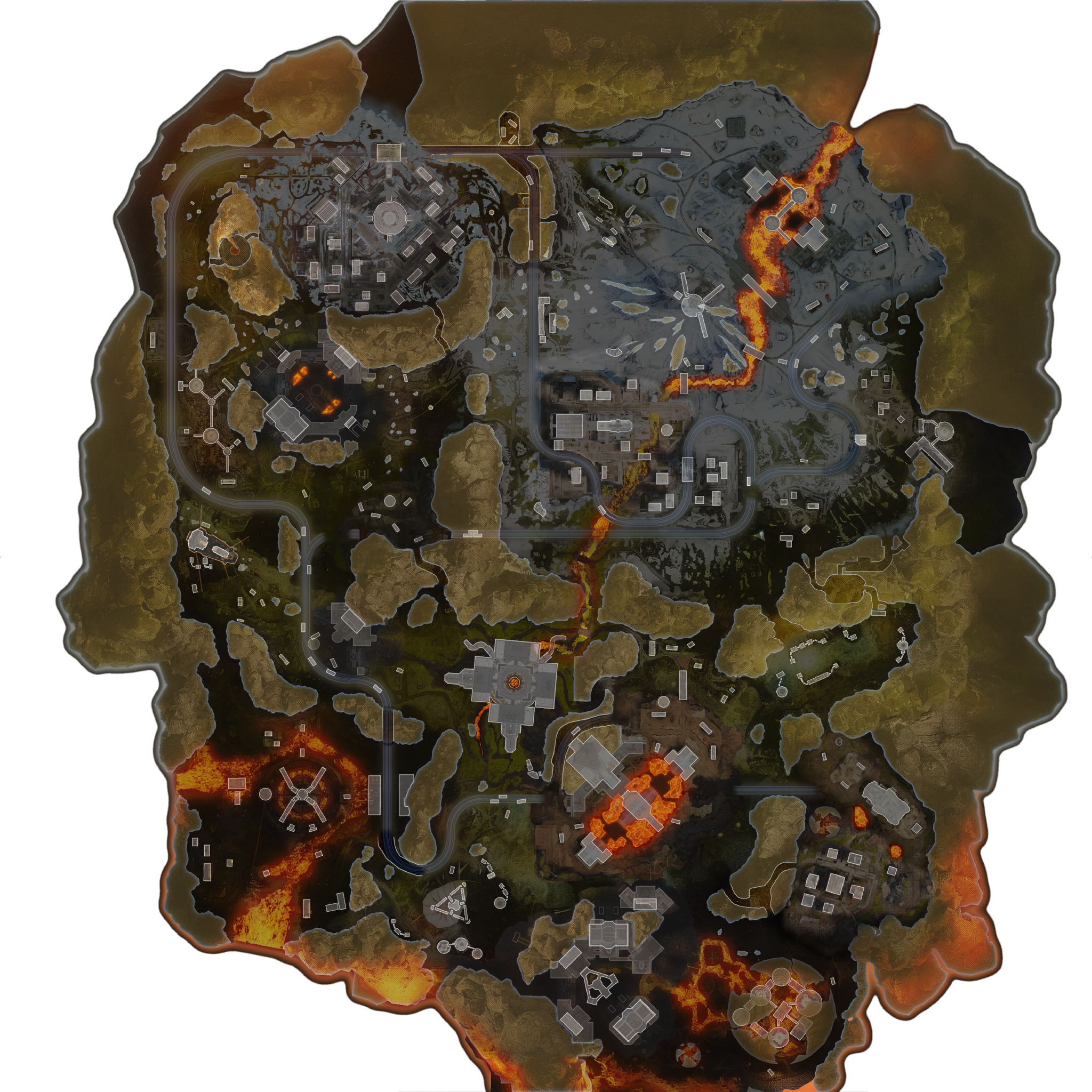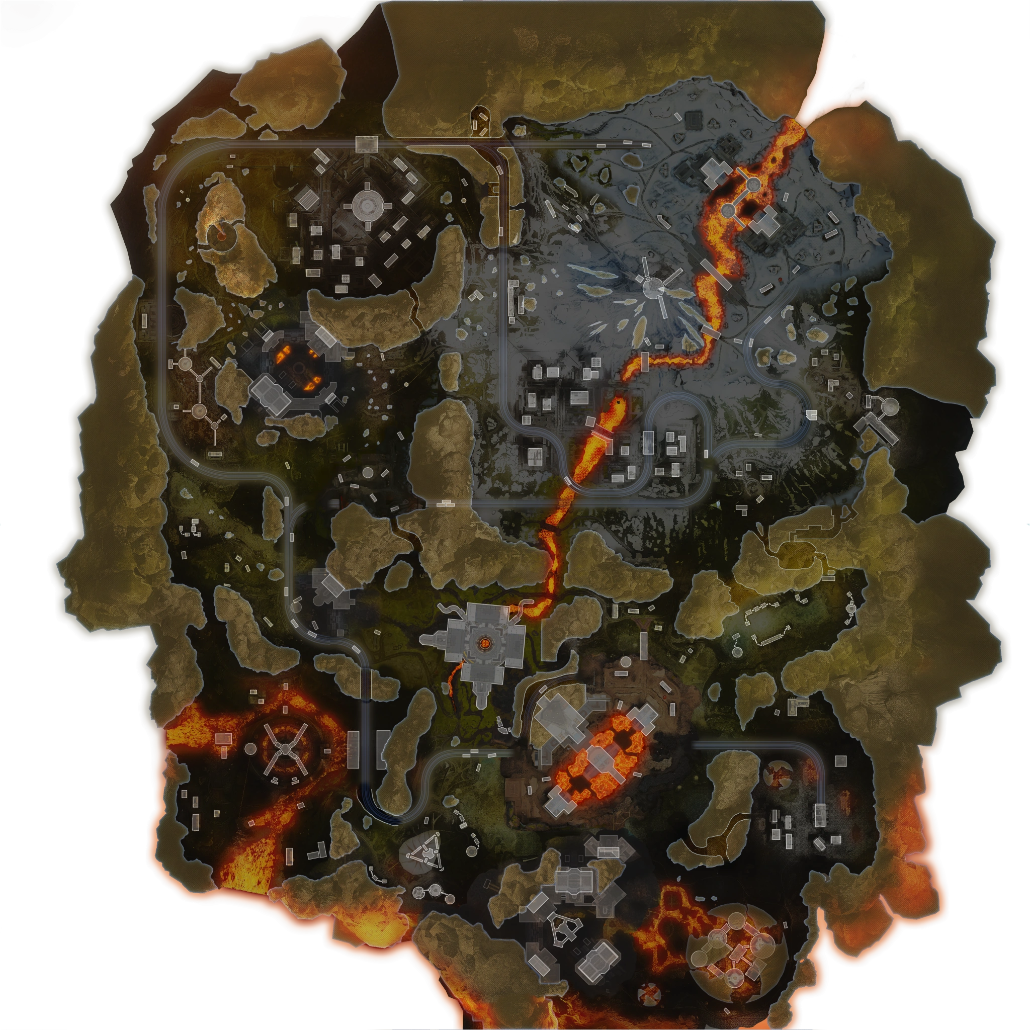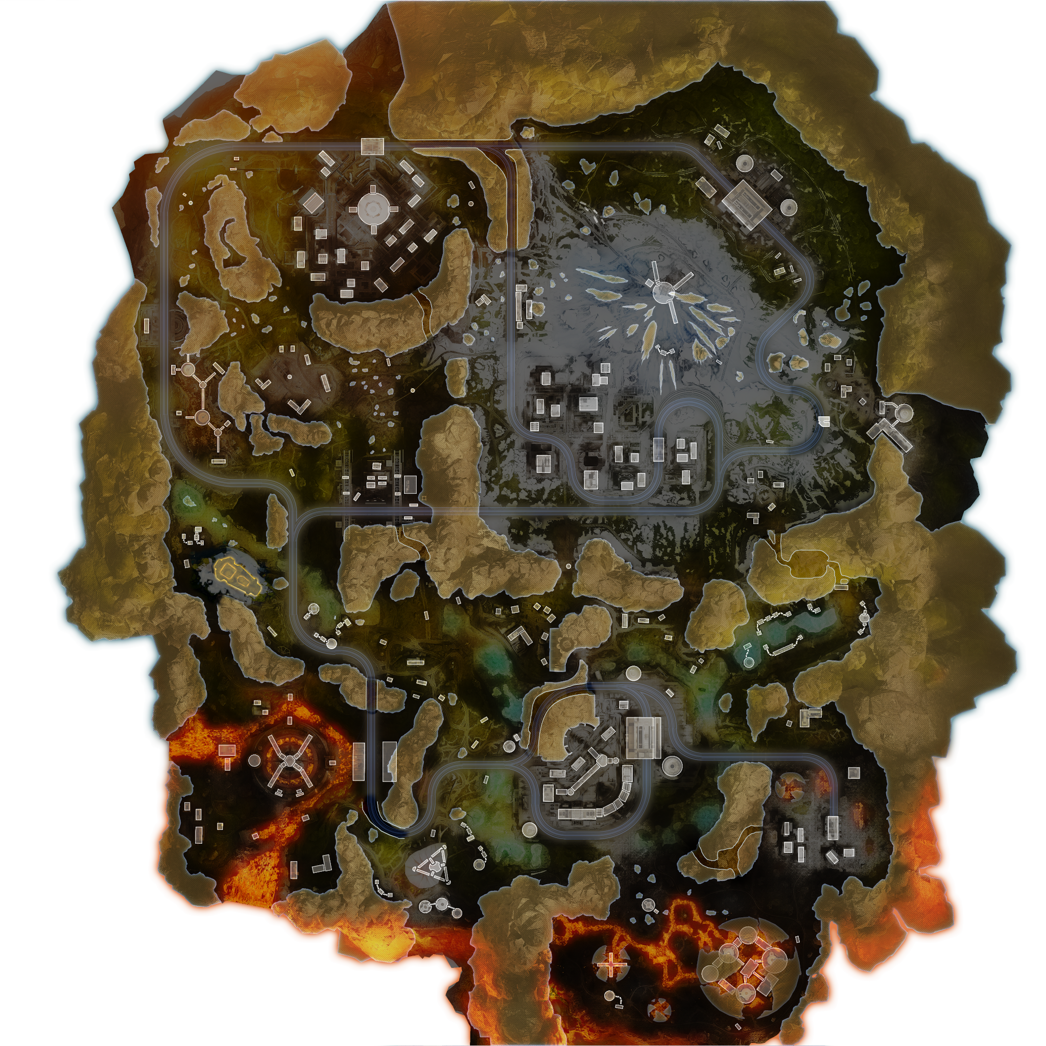 | Lava City | High Tier | Lava City features heavily burnt buildings which are similar to those in Fragments East and West. It also has a smaller version of The Dome in it as well. It is located in the southeast portion of the map. It also has a destroyed train which has some loot onboard. | Stacks |