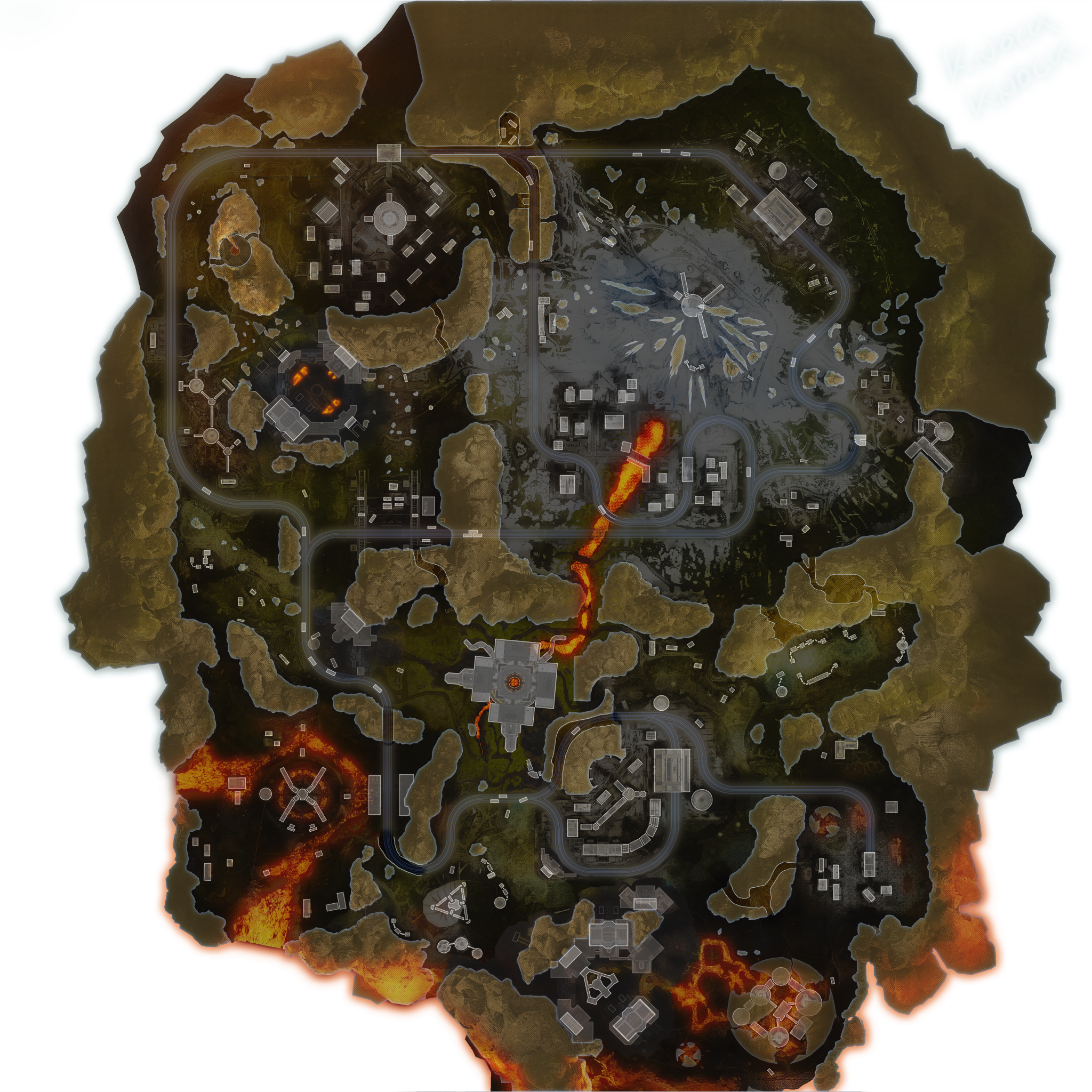| Lava Fissure | High Tier | Lava Fissure is located on the west side of the map, near Countdown. It consists of platforms anchored to the rocks suspended above a lava pit, there are three buildings on the platforms and a fourth to the west next to the train line. The Respawn Beacon is in an interesting place, right in the middle of the platforms in a small cylinder with a rotating door that can trap people inside. | 23 |