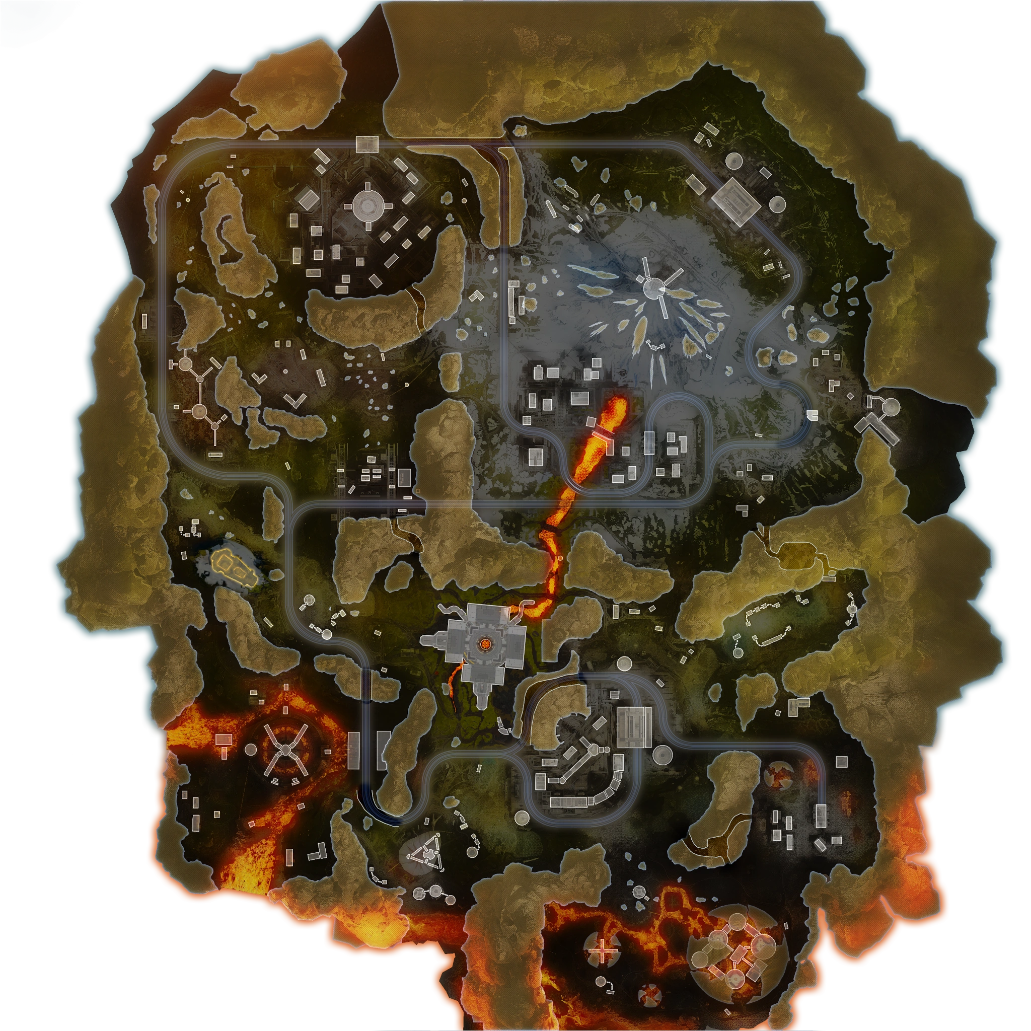 | Countdown | High Tier | Once known as "Drill Site", Countdown is located southwest of Skyhook. It features multiple pits of lava, an opening floor in the very center the player can get high-tier loot out of, as well as three Blast Walls to help fortify a squad’s position. | 21 |